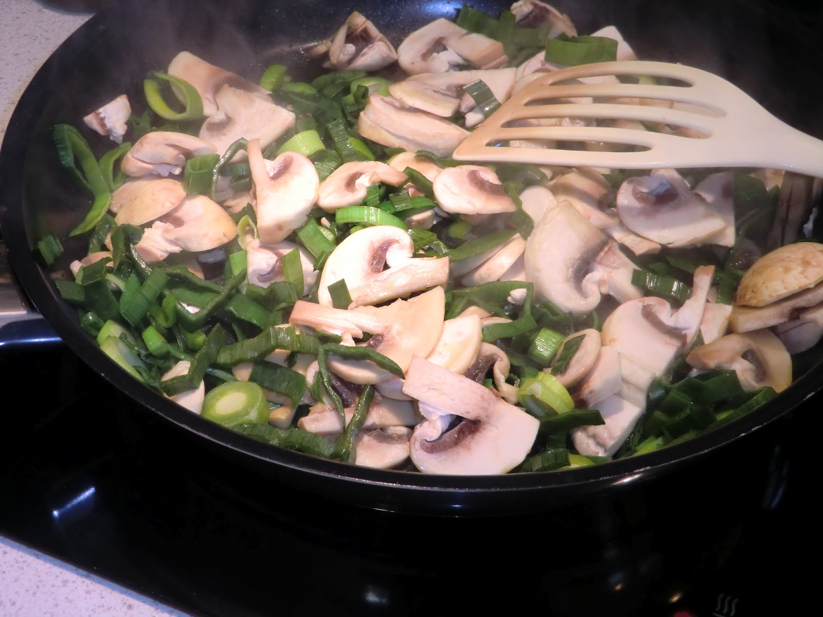Bryn/fräs svamp och purjo i olivolja några minuter under omrörning. Kvarna över lite salt och peppar.